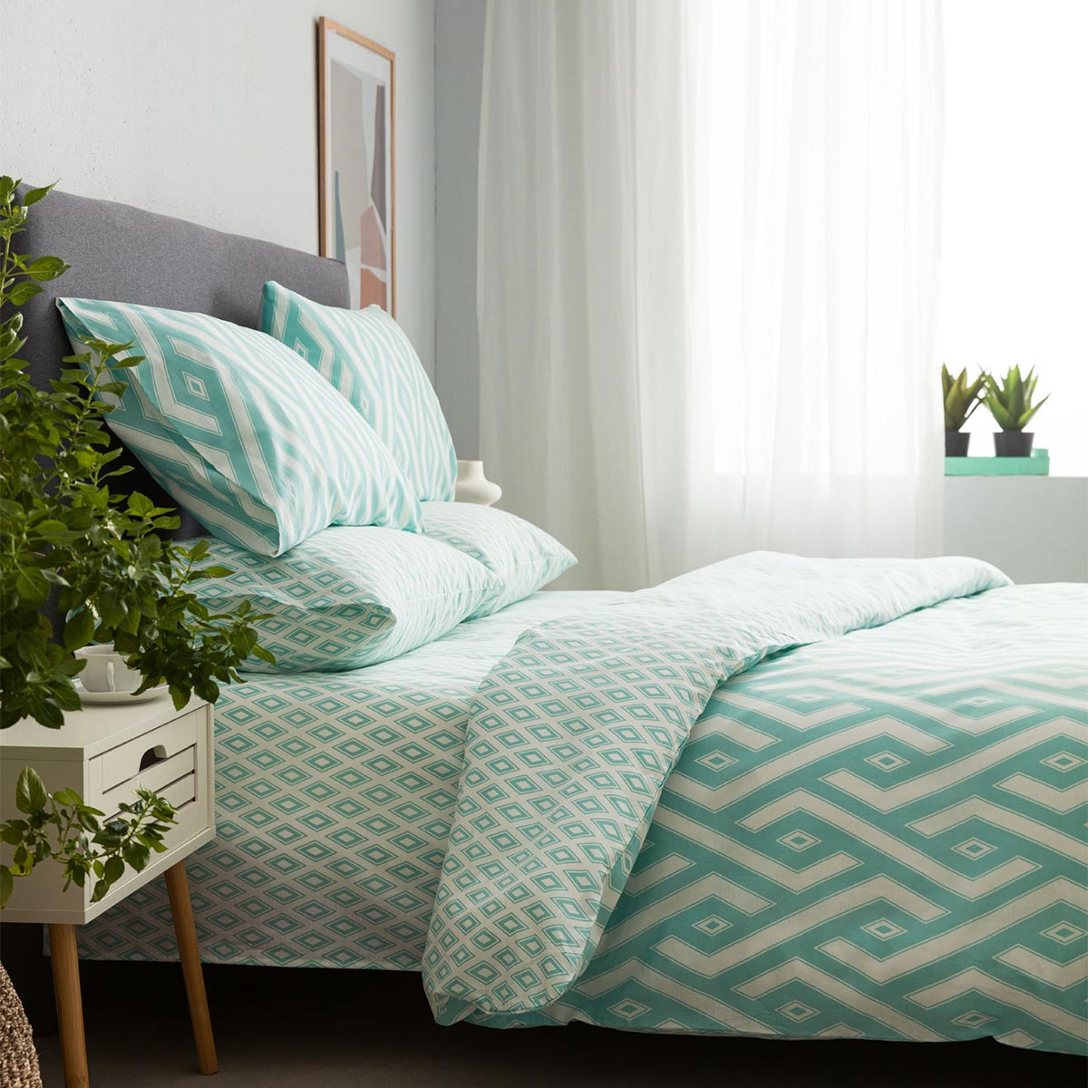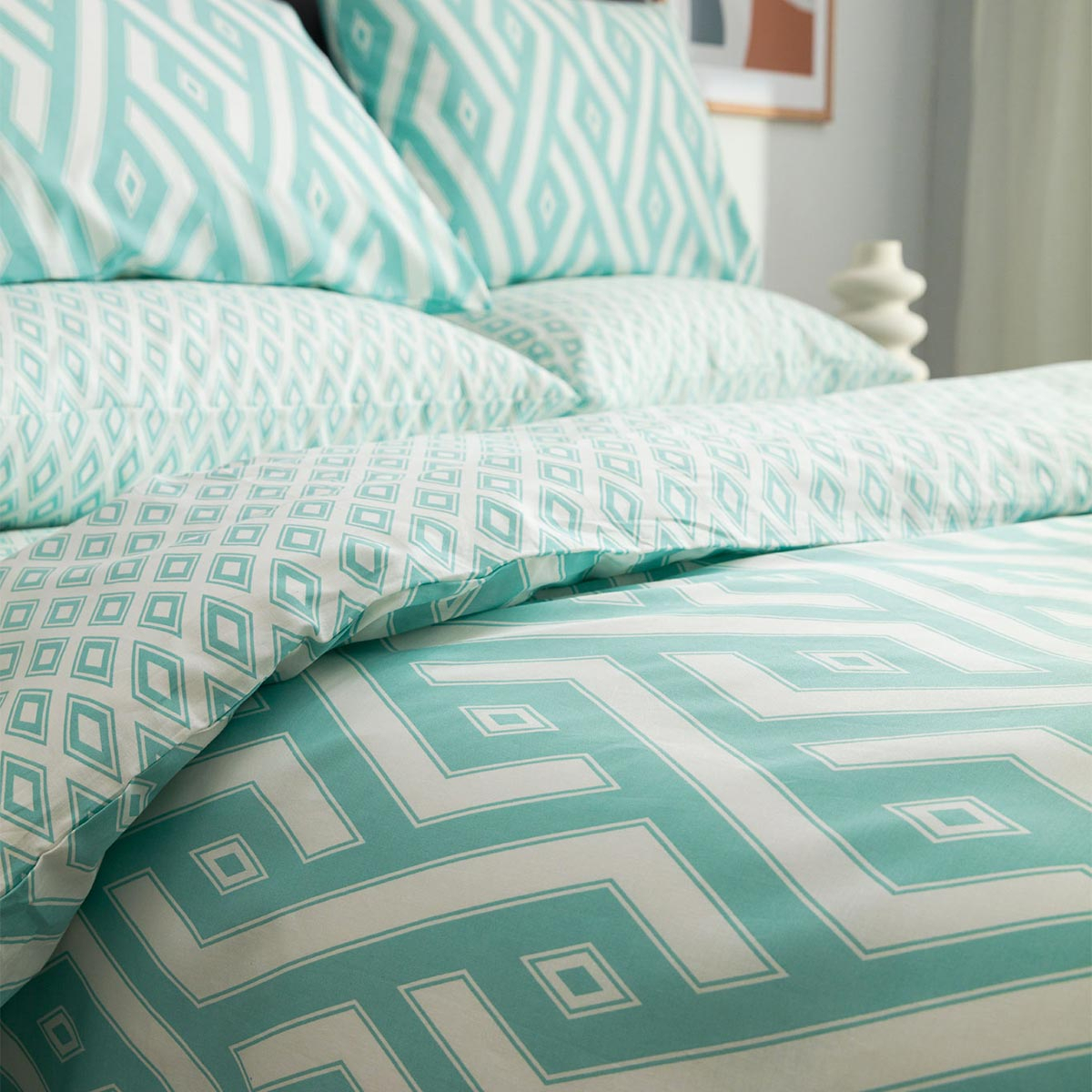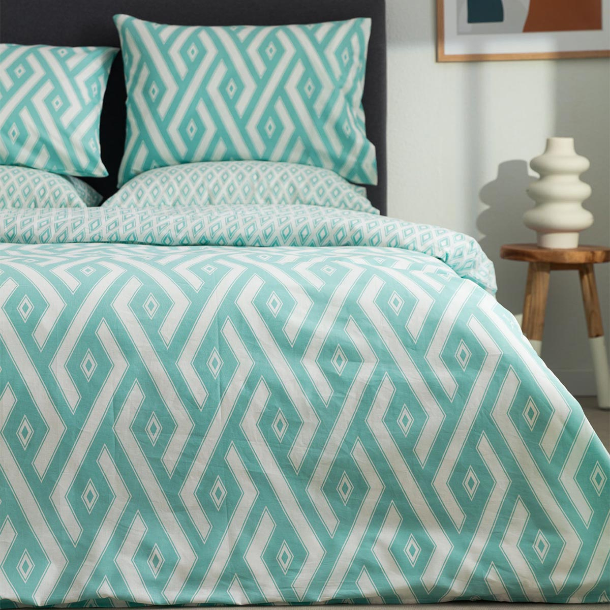 Κουβερλί υπέρδιπλο σε τυρκουάζ-λευκό χρώμα και γεωμετρικό σχέδιο από την εταιρία Vesta Home.